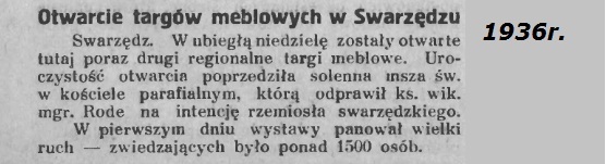 Pod wpływem sukcesów handlowych stolarzy na Targach Poznańskich w 1933r. powstała w Swarzędzu myśl zorganizowania na miejscu targów meblowych. Z inicjatywą wystąpił Cech Stolarzy. Komitet Targowy stanowili: Janiszczak (prezes), L. Krzyżaniak (sekretarz) i S. Piątek (skarbnik). Dyrektorem został J. Szandro, a zastępcą S. Jarczyński. Ogółem wystawiało swe wyroby 44 stolarzy ze Swarzędza i 5 z Poznania. Ponadto wystawiano wyroby tapicerskie, rzeźbiarskie, drogeryjne i drukarskie. Głównie wystawiono sypialnie, biurka, jadalnie, kuchnie, pokoje męskie, salony, gabinety, krzesła i stoły. Fundusz targowy zasilili: Izba Rzemieślnicza (wypłaciła organizatorom 300 zł). Cz. Gruszczyński (150 zł), Zjednoczenie Rzemiosła w Poznaniu (100 zł), Oddział swarzędzki (25 zł), Zakrzewski i Skibiński (po 50 zł) i Towarzystwo Przemysłowe (25 zł). Poza reklamą prasową w „Głosie Swarzędza”, również dwa razy dziennie Polskie Radio nadawało komunikaty o przygotowywaniu targów. Przewidywano także pogadankę przed mikrofonami radiowymi, którą miał wygłosić Sobczak. Oto wierszyki reklamowe w „Głosie Swarzędza”: